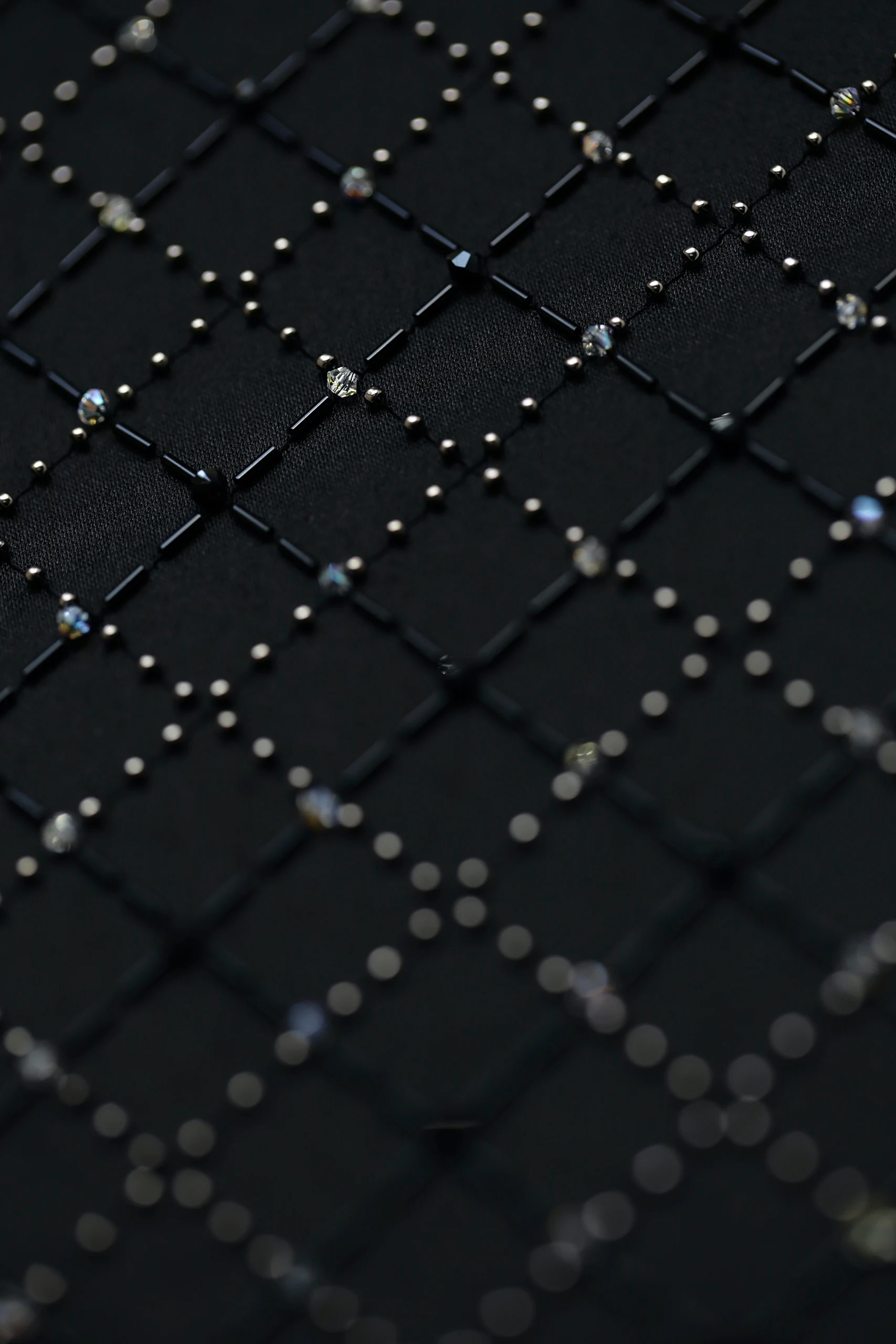 This black kimono jacket reinterprets her muted brilliance through contemporary embroidery: a geometric crystal grid encircling the waist, shimmering only when it catches the light — like a star that glows softly at the edge of the night.