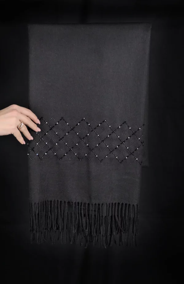 This black cashmere scarf reinterprets her muted radiance through contemporary embroidery: a hand-stitched geometric grid that shimmers only when touched by the light, echoing the star that once burned fiercely before retreating into shadow.