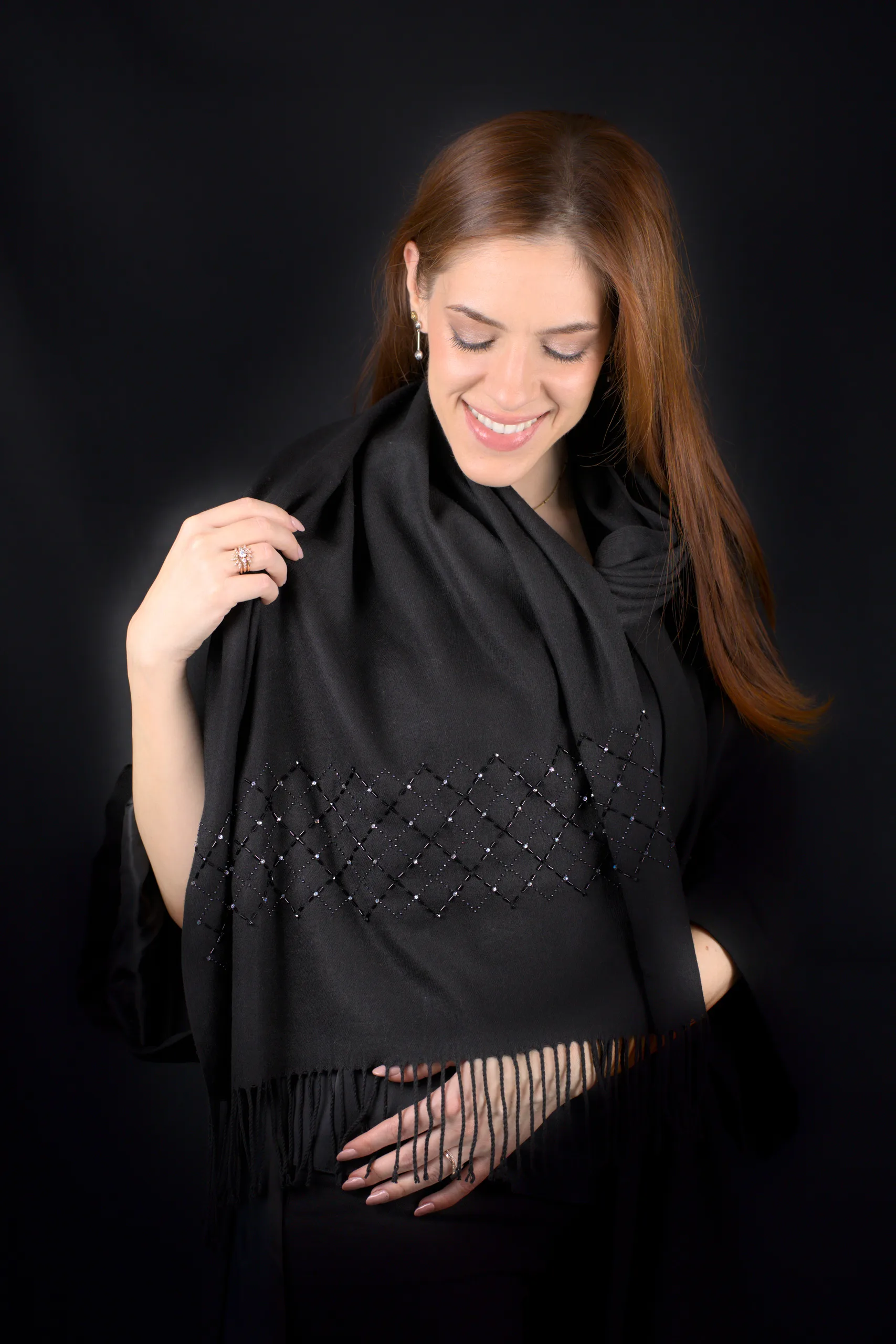 A hand-embroidered black cashmere scarf inspired by Celaeno, the mysterious Pleiades star — an art-à-porter piece of quiet elegance and refined strength.