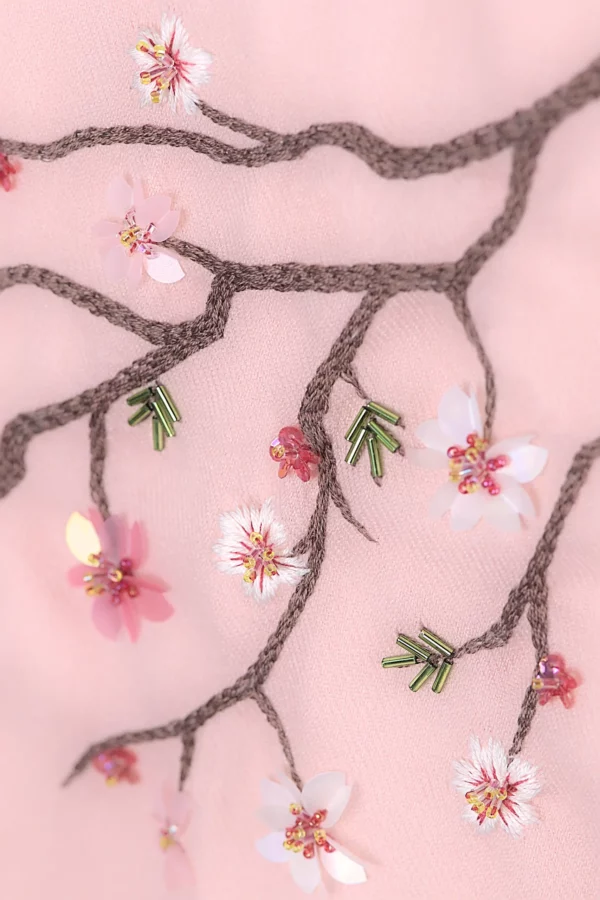 Bufanda de cachemira rosa pálido con una rama de cerezo en flor bordada a mano, inspirada en Maia, la mayor de las Pléyades — símbolo de primavera y renovación.