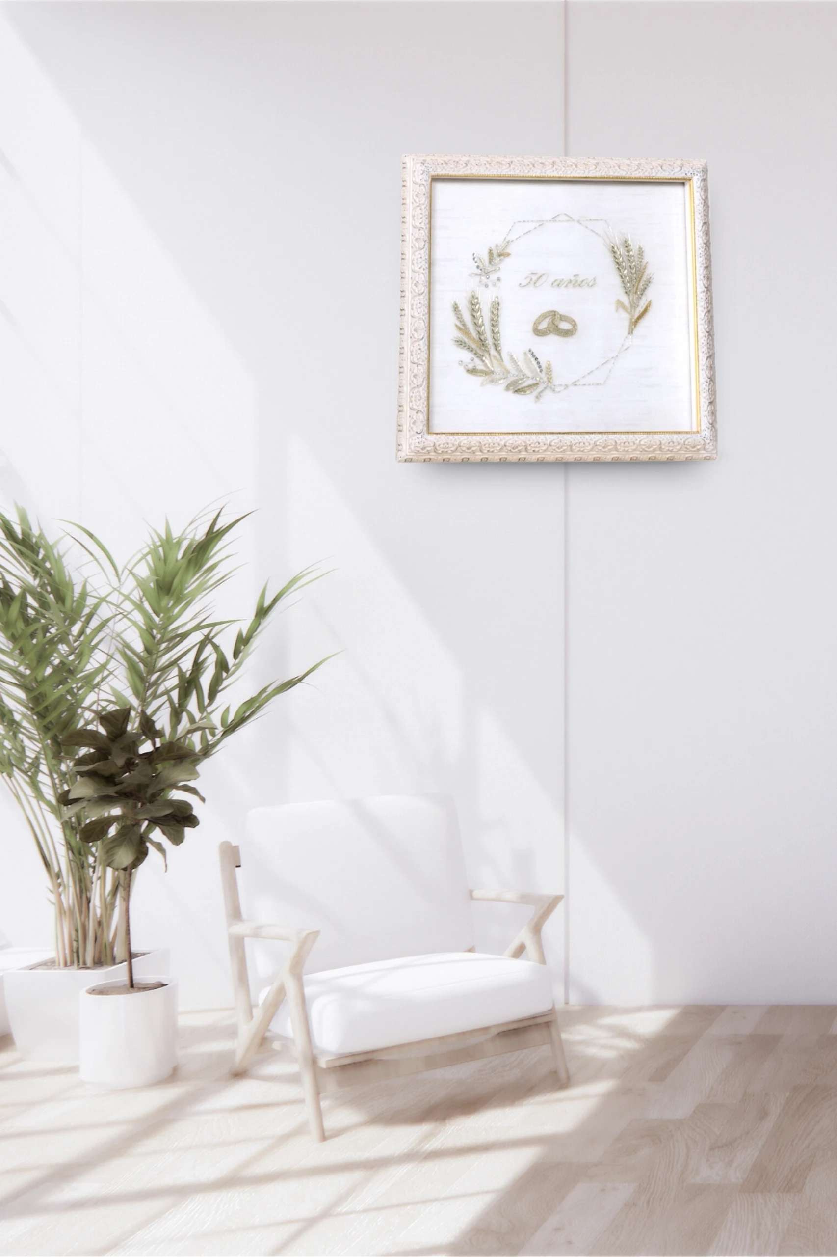 De nuestras conversaciones surgieron detalles como hilos a la espera de ser bordados: los campos dorados de trigo de su infancia, los olivos que tanto disfrutaban, los valores de constancia y armonía que habían dado forma a su vida juntos. El texto « 50 años » y las dos alianzas entrelazadas debían ocupar el centro del diseño, símbolos de devoción y unión duradera. El resto lo dejaron en mis manos: escuchar, imaginar y traducir su historia en bordado.