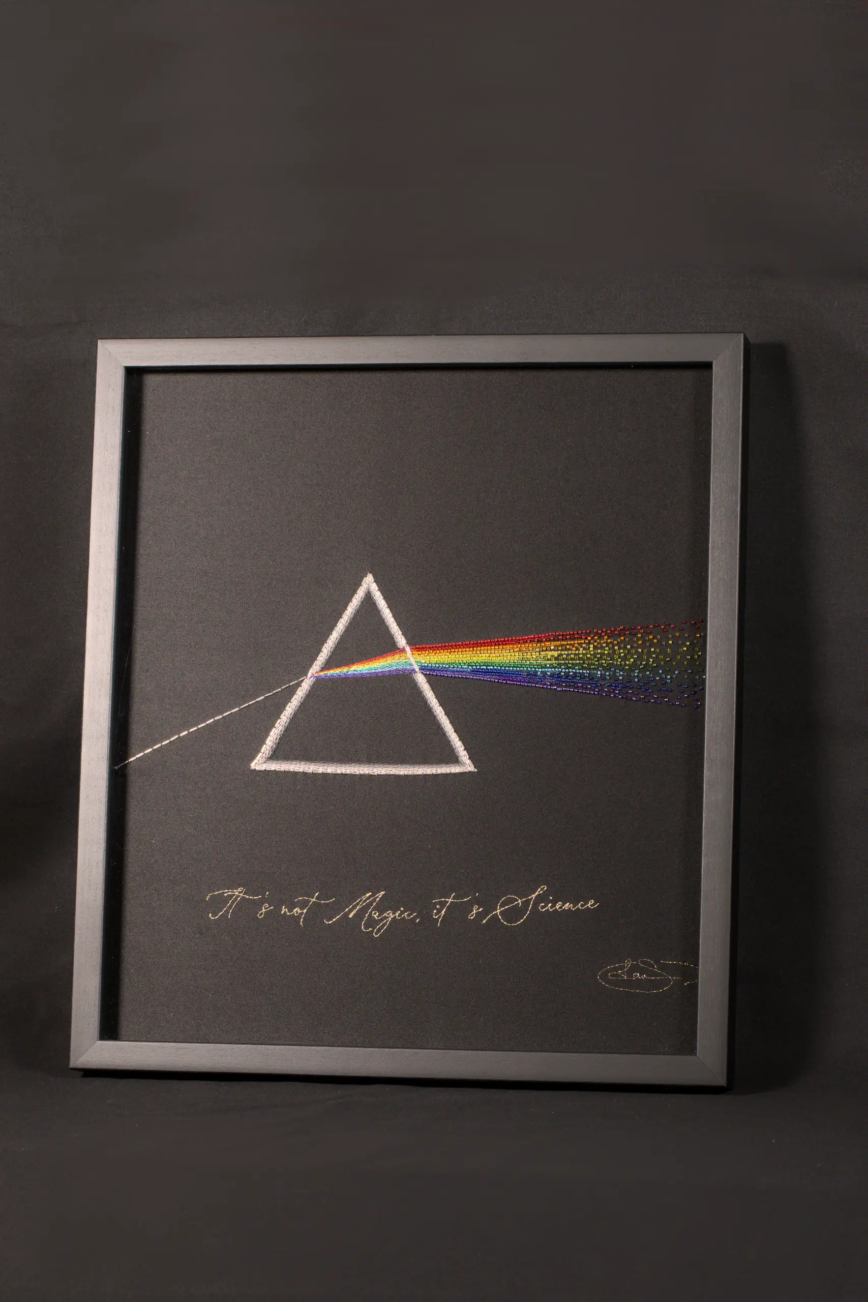 This hand-embroidered prism celebrates the poetic truth behind light and perception, where visible color emerges from invisible structure, as if by magic.